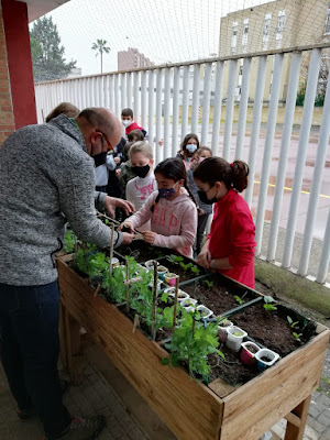Ya hemos tenido ocasión de ir pasando por el huerto todos los grupos por primera vez en el curso. Elena, la monitora de este año, nos está ayudando a entender todo el proceso haciéndonos participar en cada una de las labores: remover la tierra, regarla, plantar semillas y plantones...¡Nos encanta!