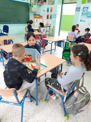 También está mañana 2° ha disfrutado de un taller de cuentos dirigido por la mamá y el papá de Adrián." Un duende en paro" y "La montaña más alta del mundo" fueron los cuentos seleccionados para el taller. Además, realizaron una actividad complementaria relacionada con el segundo libro. Cada niñ@ decoró un libro con el título de su libro favorito y lo ilustró y entre tod@s construyeron su montaña de libros. Una forma divertida de recrear la temática de uno de los libros.